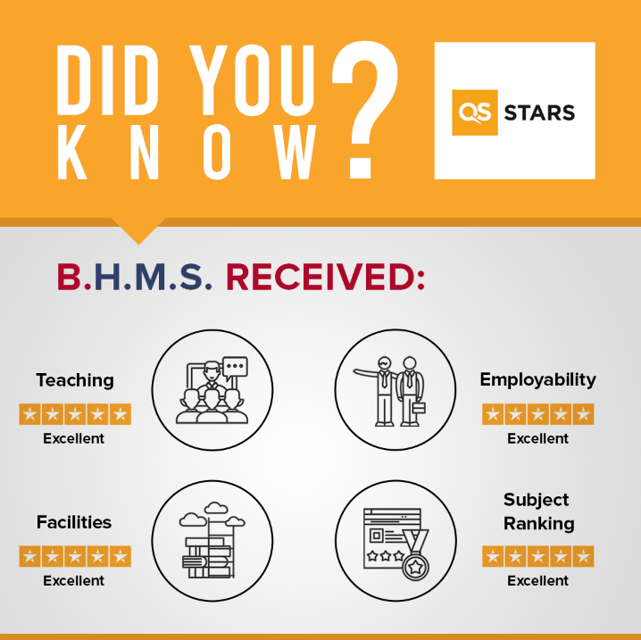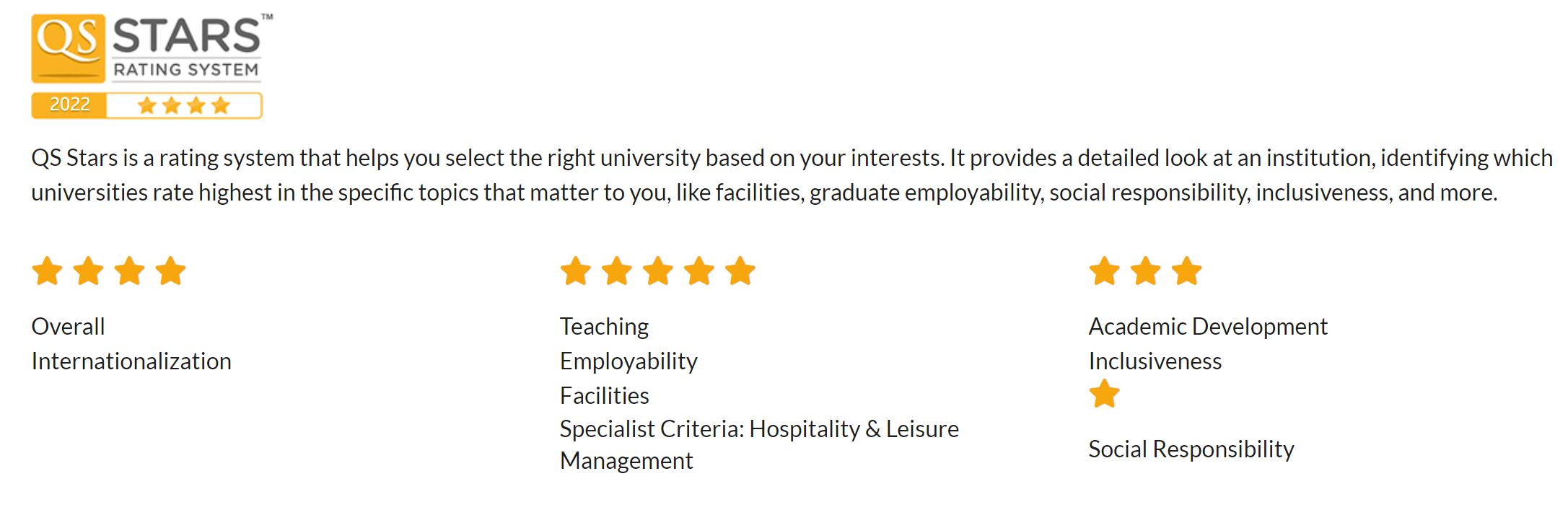 在2022年最新的QS星级大学评定中,BHMS瑞士工商酒店管理学院在教学(Teaching)、就业(Employability)、硬件设施(Facilities)和科学排名(Subject Ranking)中皆获得高分,总体星级为四颗星,正式进入了QS四星大学的行列!