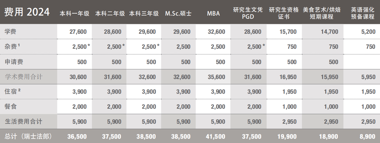 学费每年约为4万瑞郎(约人民币30万元),已包含住宿、膳食、教材、医保。新生奖学金3000瑞郎(约人民币2.5万元)。折合下来,本科第一年的学费仅需33500瑞郎(约人民币27万元)。