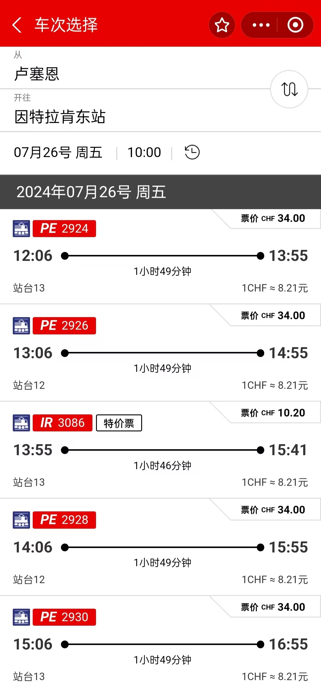 卢塞恩到因特拉肯的车次