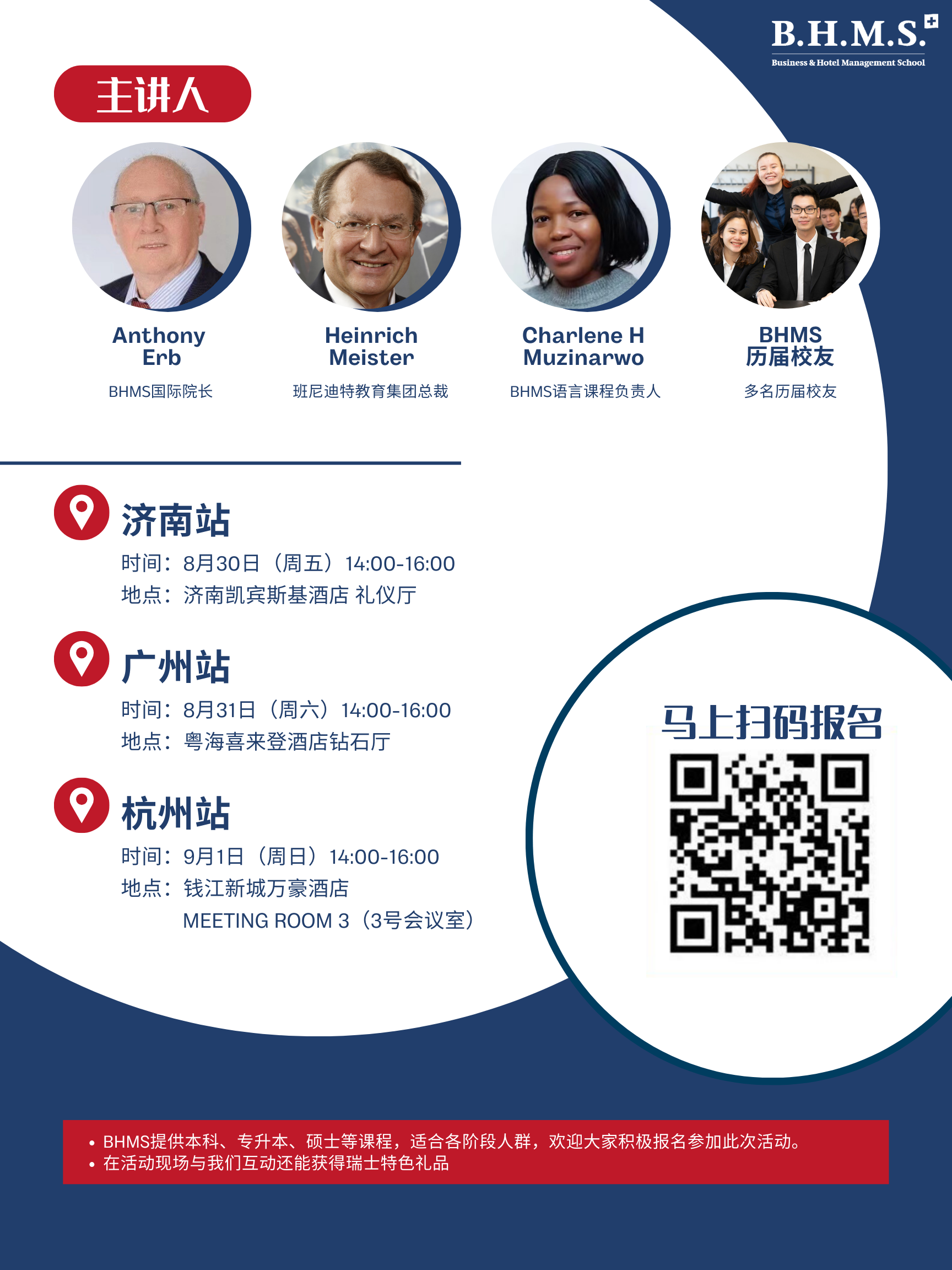 BHMS卢塞恩酒店管理商学院作为瑞士国际化程度最高的大学之一,我们的毕业生遍布全球150+个国家和地区。这个八月,BHMS的老师和校友将会来到中国,跟大家分享瑞士教育的秘诀以及欧洲工作的经历。