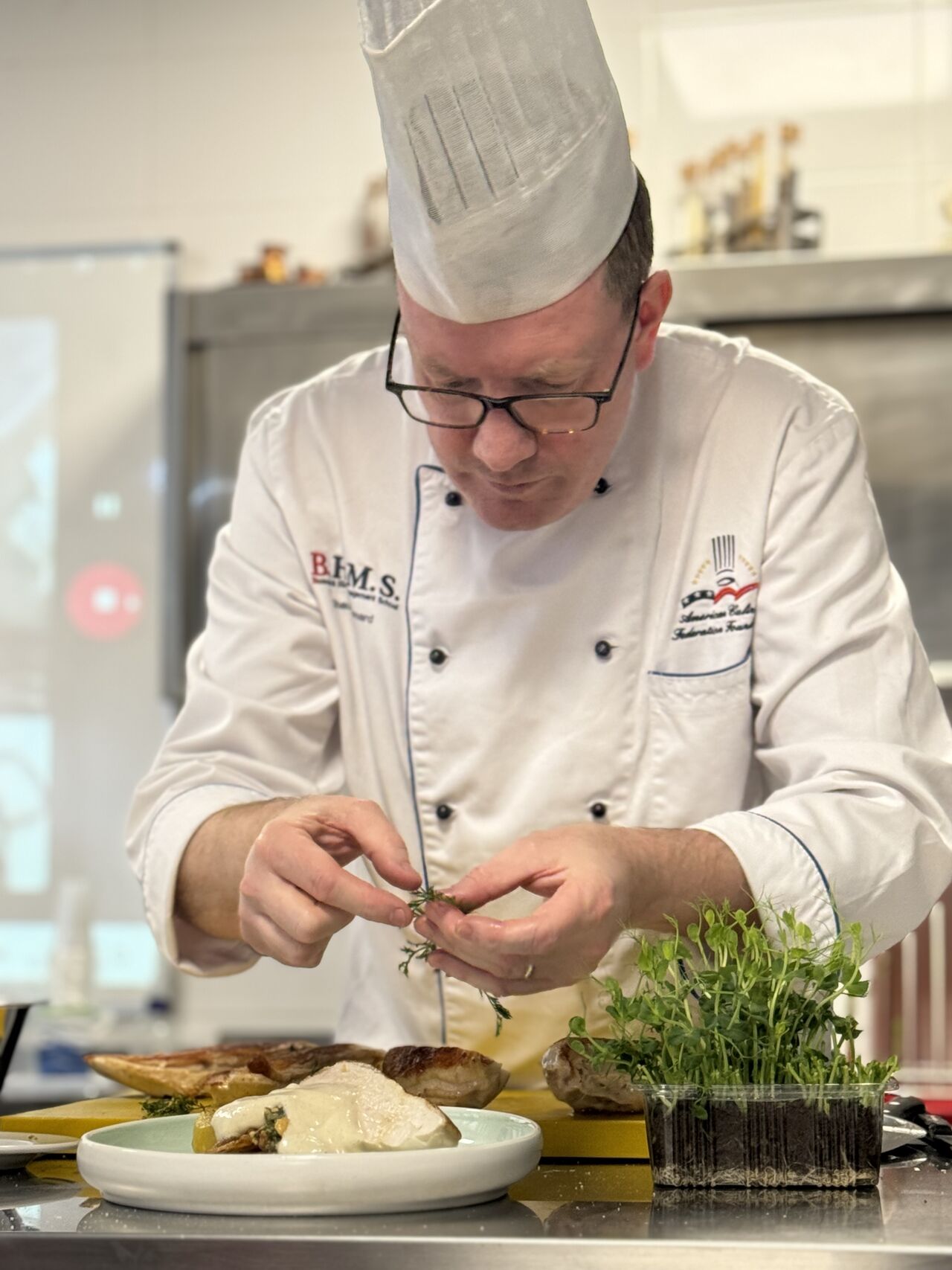 直到2004年,Shaun开始投身教育行业,曾在多个瑞士酒店管理院校任职。2016年,Shaun加入BHMS的教师团队,全面负责西方美食艺术专业的教学与管理工作。他的教学风格以严谨和热情著称,深受学生喜爱。在课堂中,他不仅传授烹饪技术,还注重培养学生的创造力、团队合作精神以及对食材的深刻理解,鼓励学生从经典中汲取灵感,同时勇于尝试新方法。通过他毫无保留地教导,许多学生已经在全球各地的顶级餐厅和酒店中崭露头角,成为烹饪界的新星。