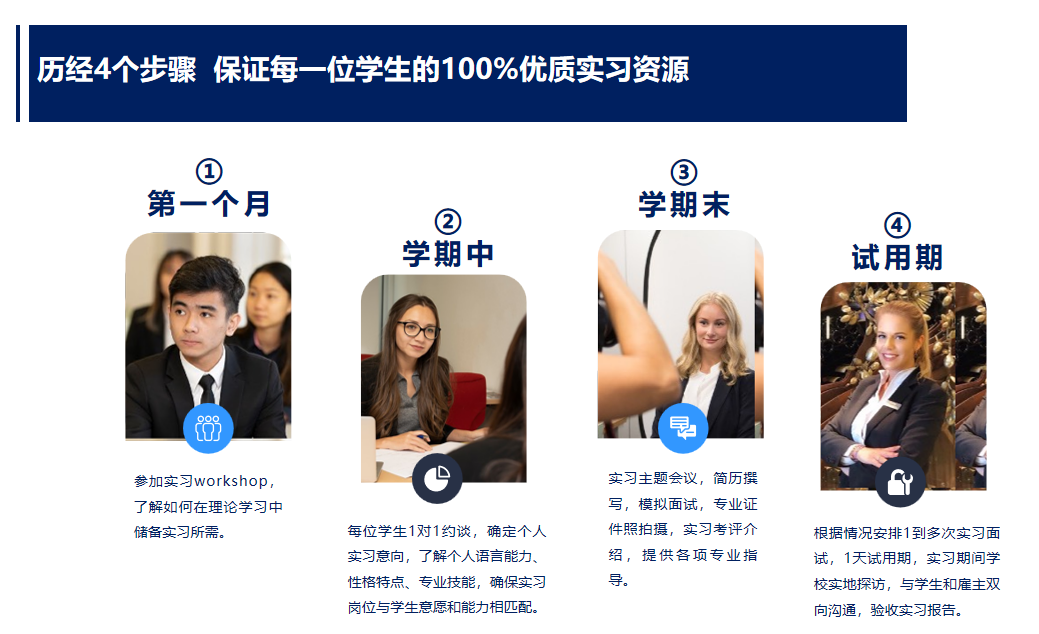 得益于BHMS背后的班尼迪特百年教育集团的资源优势,我校是瑞士唯一拥有独立子公司MASTERWORK提供实习和就业机会的学校。MASTERWORK拥有众多全球知名酒店、邮轮、航空、奢侈品集团资源,集团HR高管亲自到学校进行一年两次,为期三个月的大型校园招聘会Career Days,推荐学生到美国、英国、德国、法国、阿联酋、马尔代夫等旅游业发达国家实习与就业。