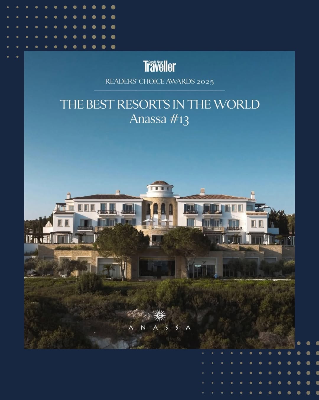 2025年,Anassa度假村获权威旅游杂志《康泰纳仕旅行者》中“全球最佳度假村”第13名。