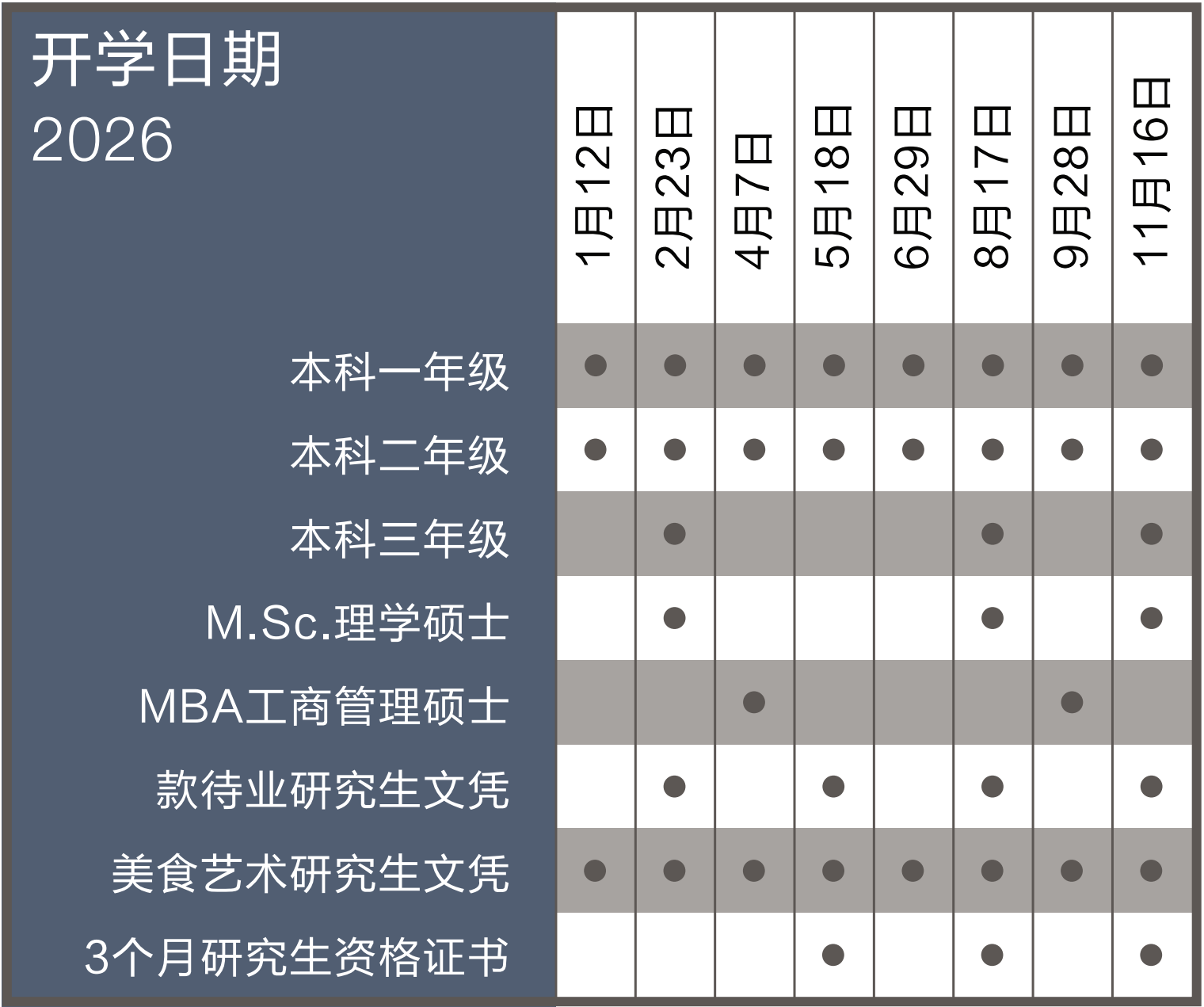 了照顾全球各国的学制和毕业时间,我们全年设有多次入学时间可供申请人选择(请见右表)。
