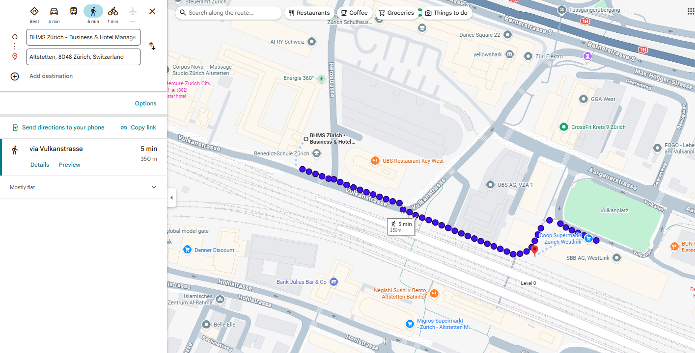 BHMS苏黎世校区地处苏黎世市中心,交通极为便利。从学校出发,步行5分钟即可到达Altstetten火车站,乘车10分钟便能抵达苏黎世主火车站和班霍夫大街,让学生轻松畅达城市核心区域,尽享高效便捷的购物、休闲与生活体验。