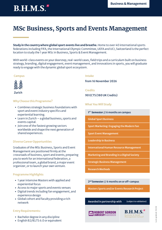 BHMS卢塞恩酒店管理商学院苏黎世校区现已开放申请,诚邀全球学子加入。无论你志在商务管理、体育与活动、银行与金融还是航空公司管理,这里都将为你提供广阔的发展平台。